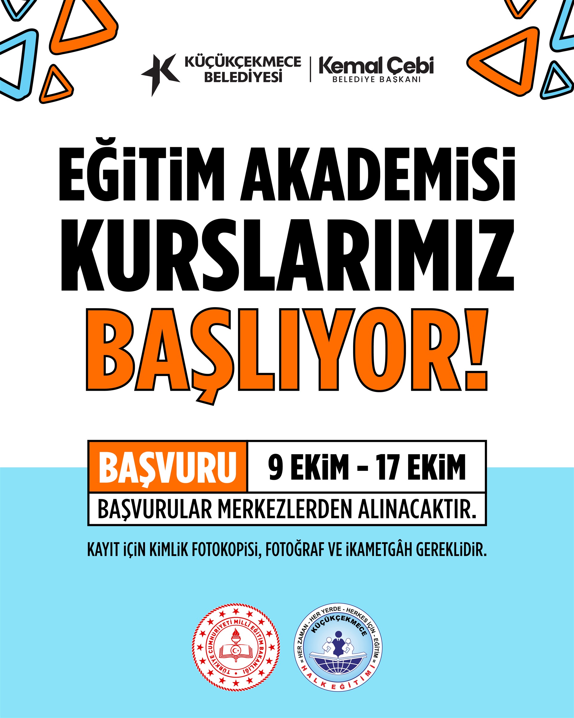 Kontenjanların sınırlı olduğu Eğitim Akademisi Kursları için son başvuru tarihi 17 Ekim. Eğitimlere katılmak isteyenler kurs merkezlerine; ikametgâh, kimlik fotokopisi ve 1 adet vesikalık fotoğrafla başvuruda bulunabilir. Küçükçekmece Halk Eğitim Merkezi tarafından alanında uzman eğitmenler tarafından verilecek eğitimleri başarıyla tamamlayanlar, Milli Eğitim Bakanlığı onaylı katılım belgesi almaya hak kazanacak.