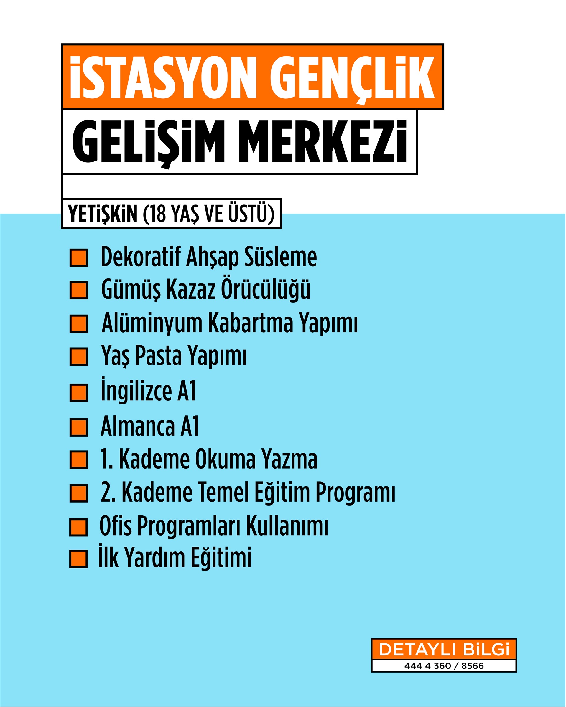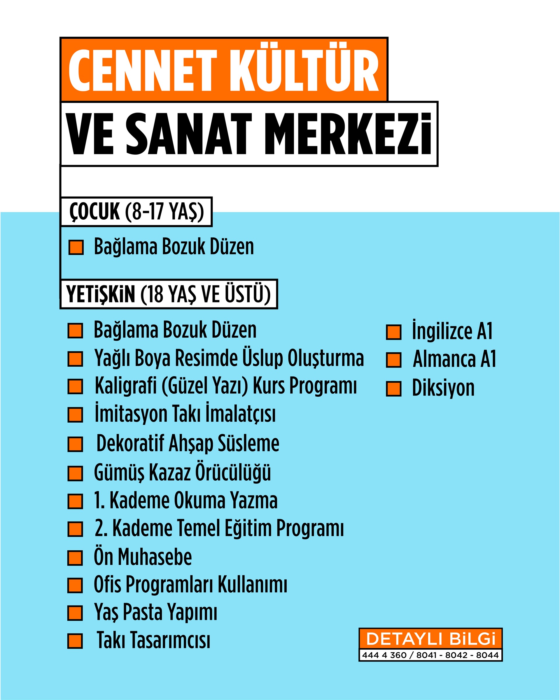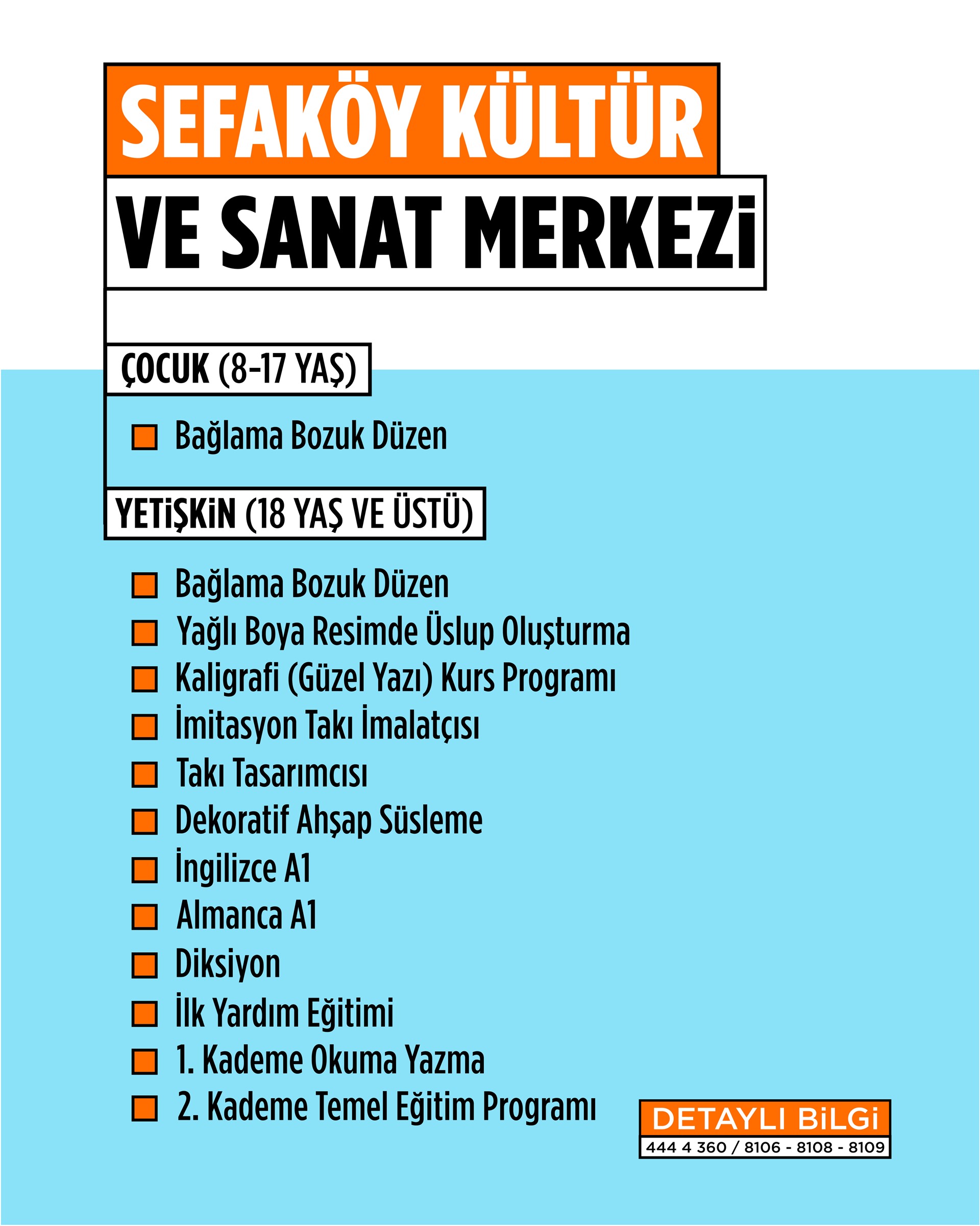 Sefaköy, Cennet ve Atakent Kültür ve Sanat Merkezi, Kemal Paşa Semt Konağı ve İstasyon Gençlik Gelişim Merkezi’nde gerçekleştirilecek kurslar; 8-17 yaş arası çocuklar ve 18 yaş üstü yetişkinler olmak üzere iki kategoride düzenlenecek. Çocuklar için Bağlama Bozuk Düzen, yetişkinler için ise; Bağlama Bozuk Düzen, Yağlı Boya Resimde Üslup Oluşturma, Kaligrafi, İmitasyon Takı İmalatçısı, Takı Tasarımcısı, Dekoratif Ahşap Süsleme, İngilizce A1, Almanca A1, 1. Kademe Okuma Yazma, 2. Kademe Temel Eğitim, Diksiyon, İlk Yardım, Gümüş Kazaz Örücülüğü, Yaş Pasta Yapımı, Ön Muhasebe, Ofis Programları Kullanımı, Alüminyum Kabartma Yapımı ve Sanatsal Mozaik gibi branşlar da eğitimler verilecek.
