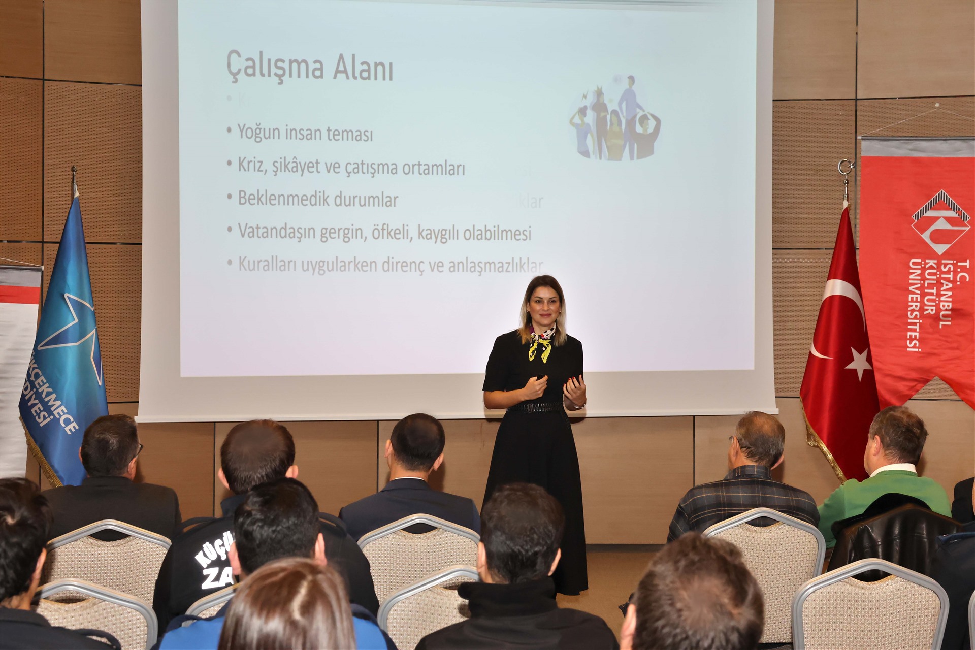 İnsan Kaynakları ve Eğitim Müdürlüğü tarafından düzenlenen eğitimde; Doç. Dr. Burcu Türk ve Dr. Öğr. Üyesi Ezgi Özkan stres ve öfke yönetimi, Prof. Dr. Işıl Zeybek etkili iletişim teknikleri ve Dr. Öğr. Üyesi Serkan Seyhan hukuki yetkiler gibi konularda zabıta personeline ayrıntılı bilgi verdi.